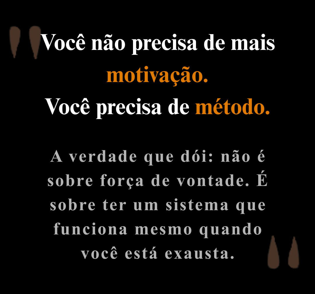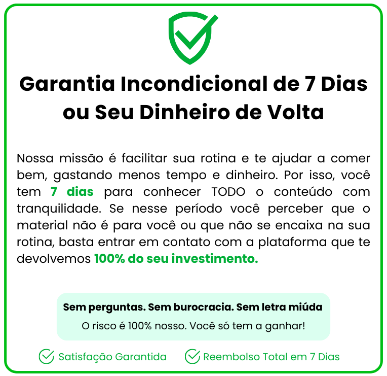 Você não vai receber centenas de receitas aleatórias que nunca vai usar. Vai receber um sistema prático, testado e aplicável que funciona na vida real.